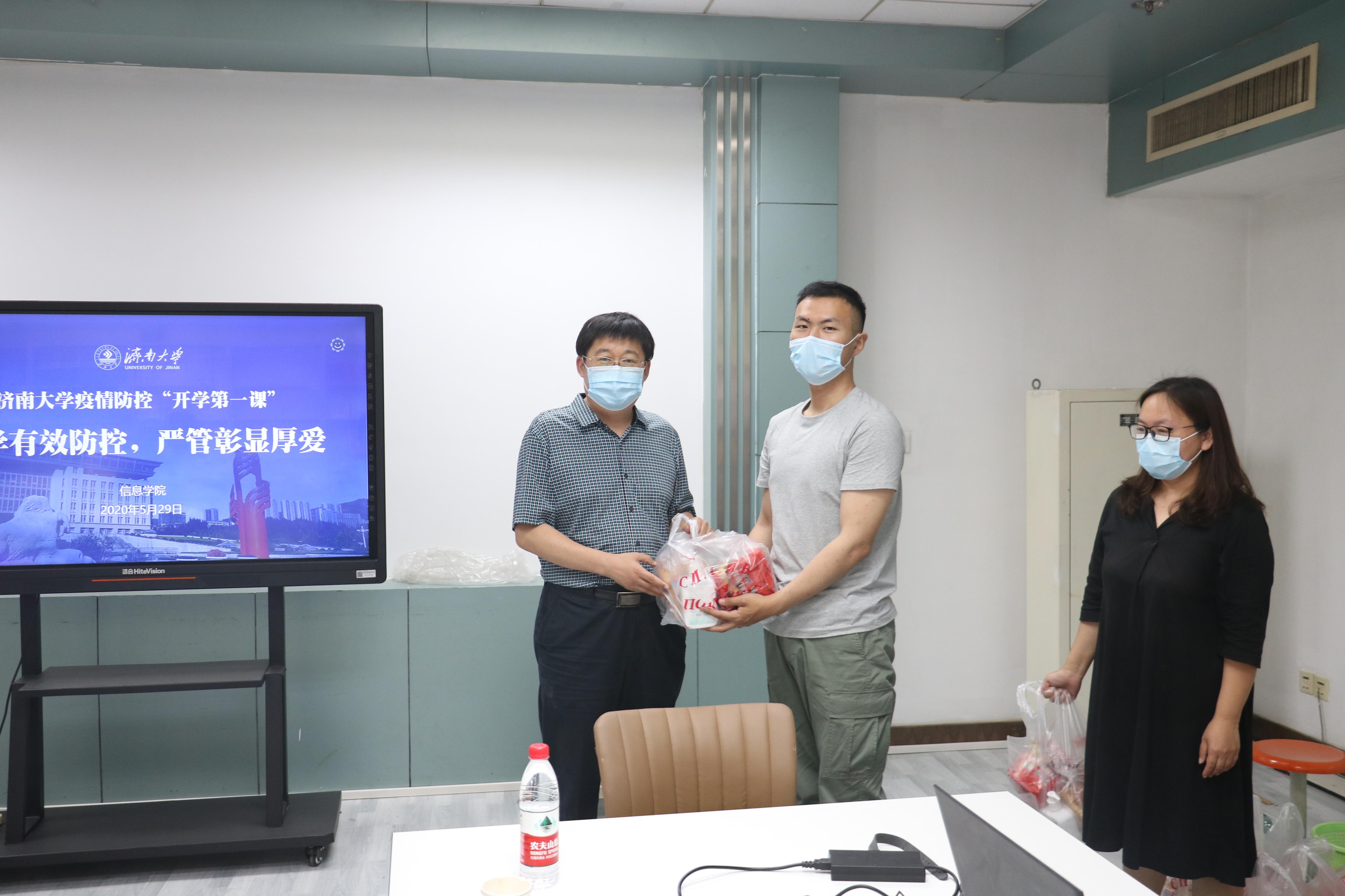 学生违反疫情防控相关纪律的处理方案》,为同学们详细讲授了在校期间进出校园、宿舍防护、就餐、个人健康监测等多方面日常纪律要求,教育引导学生严格遵守党和国家关于疫情防控的法律法规,增强法治意识和爱校荣校意识。会后,学院为返校学生发放“健康大礼包”。