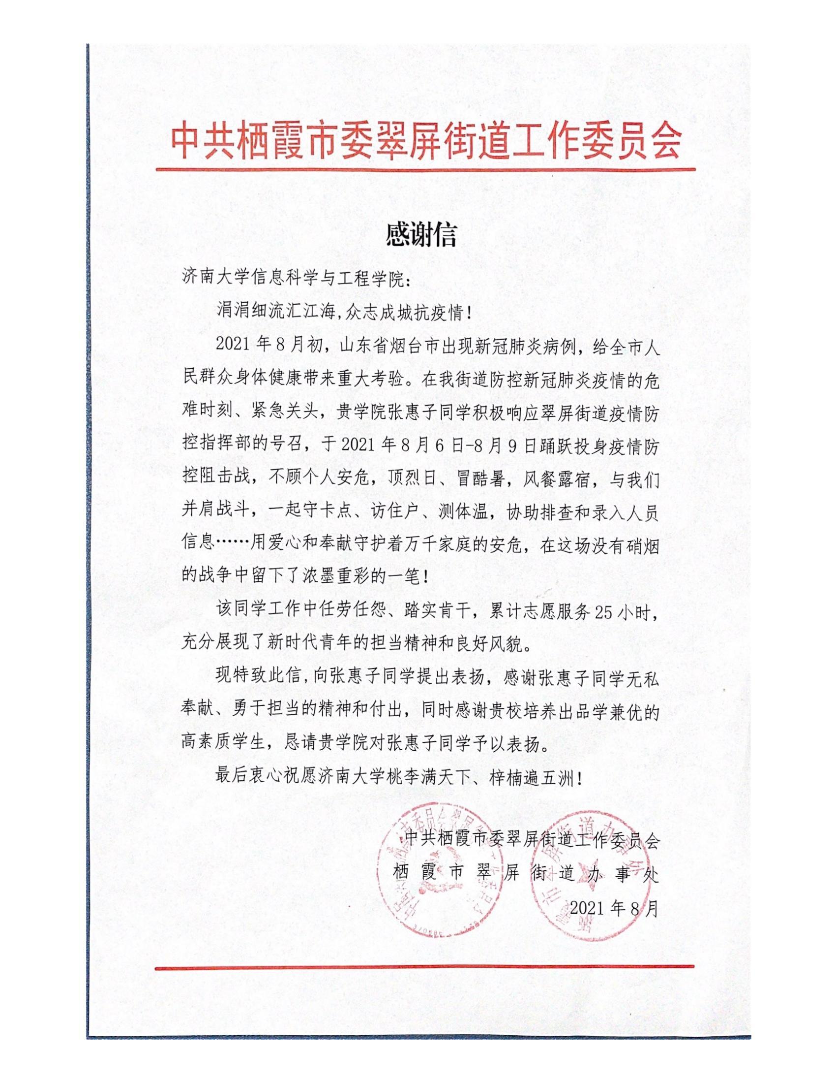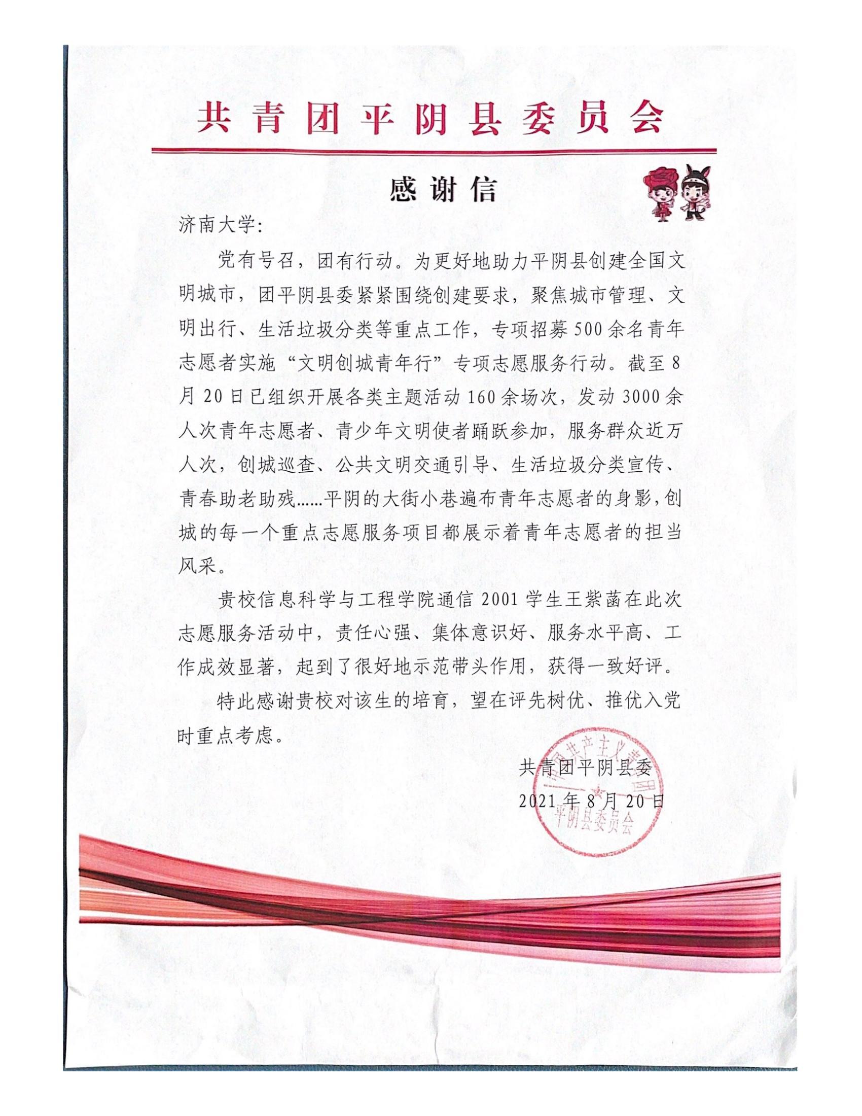 收到来自共青团平阴县委员会和中共栖霞市翠屏街道工作委员会的感谢信,感谢福利姬