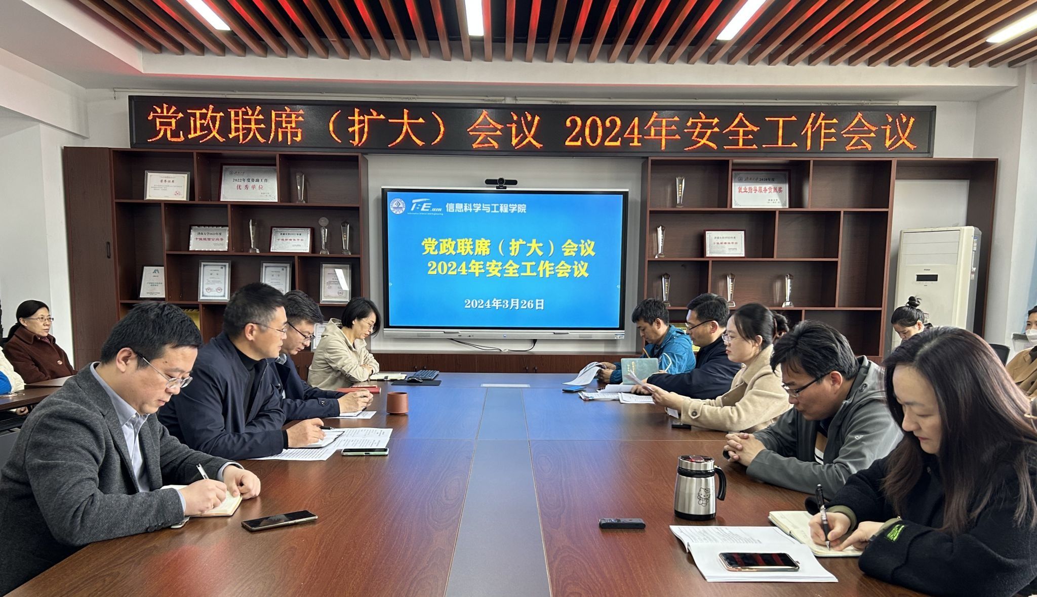 在12j704会议室召开党政联席(扩大)会议暨2024年安全工作会议。学院领导班子、各系主任、科研平台负责人、组织员、各实验室、机房负责人、学工人员参加会议。会议由学院党委书记夏卫东主持。