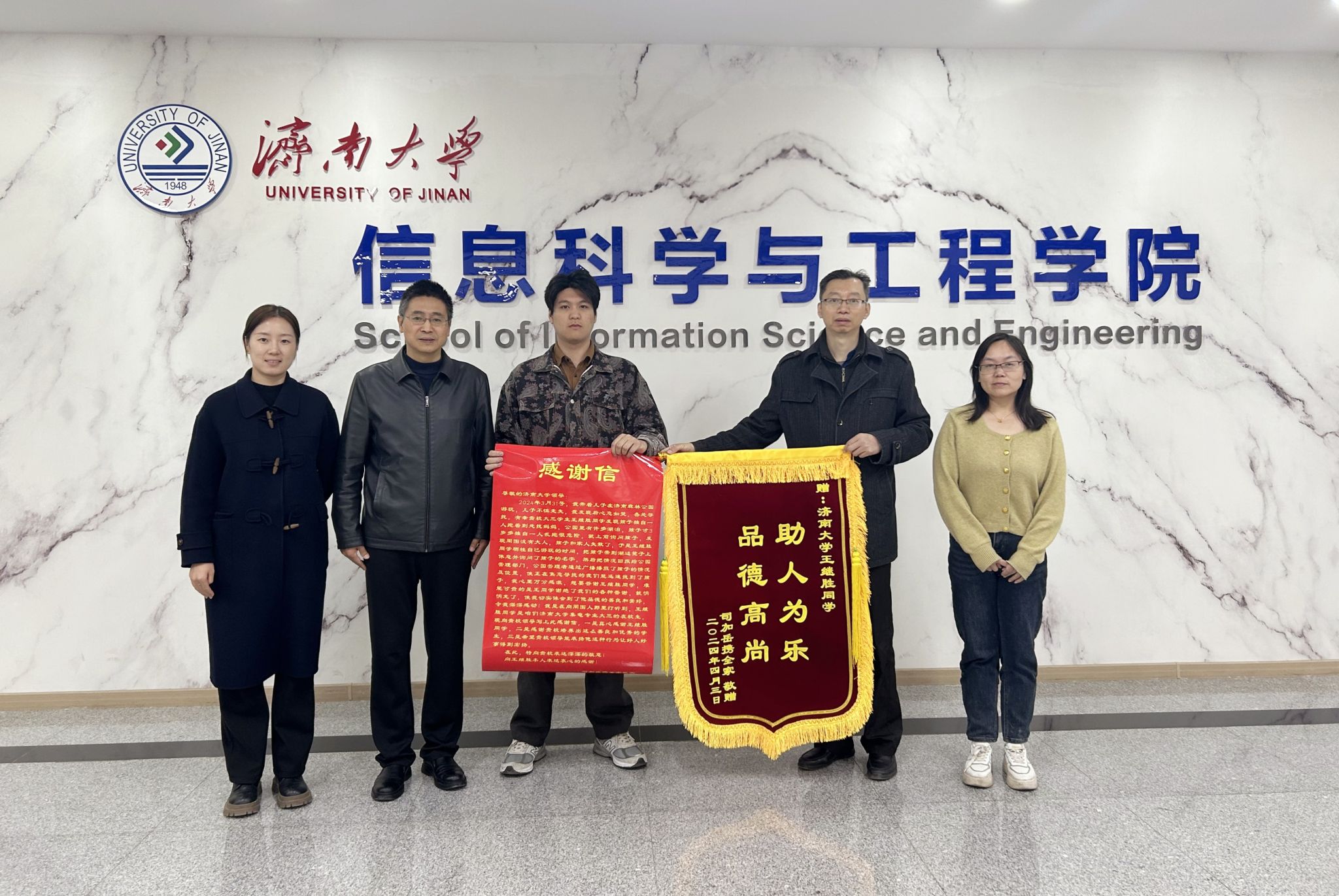 信息学院的同学,于是便送来了感谢信和锦旗,表达谢意。他衷心感谢学院老师教育培养出如此品德高尚、充满爱心、谦逊有礼的学生,体现了教书育人、崇德向善的教育本真,弘扬了社会新风尚、传递了社会正能量。