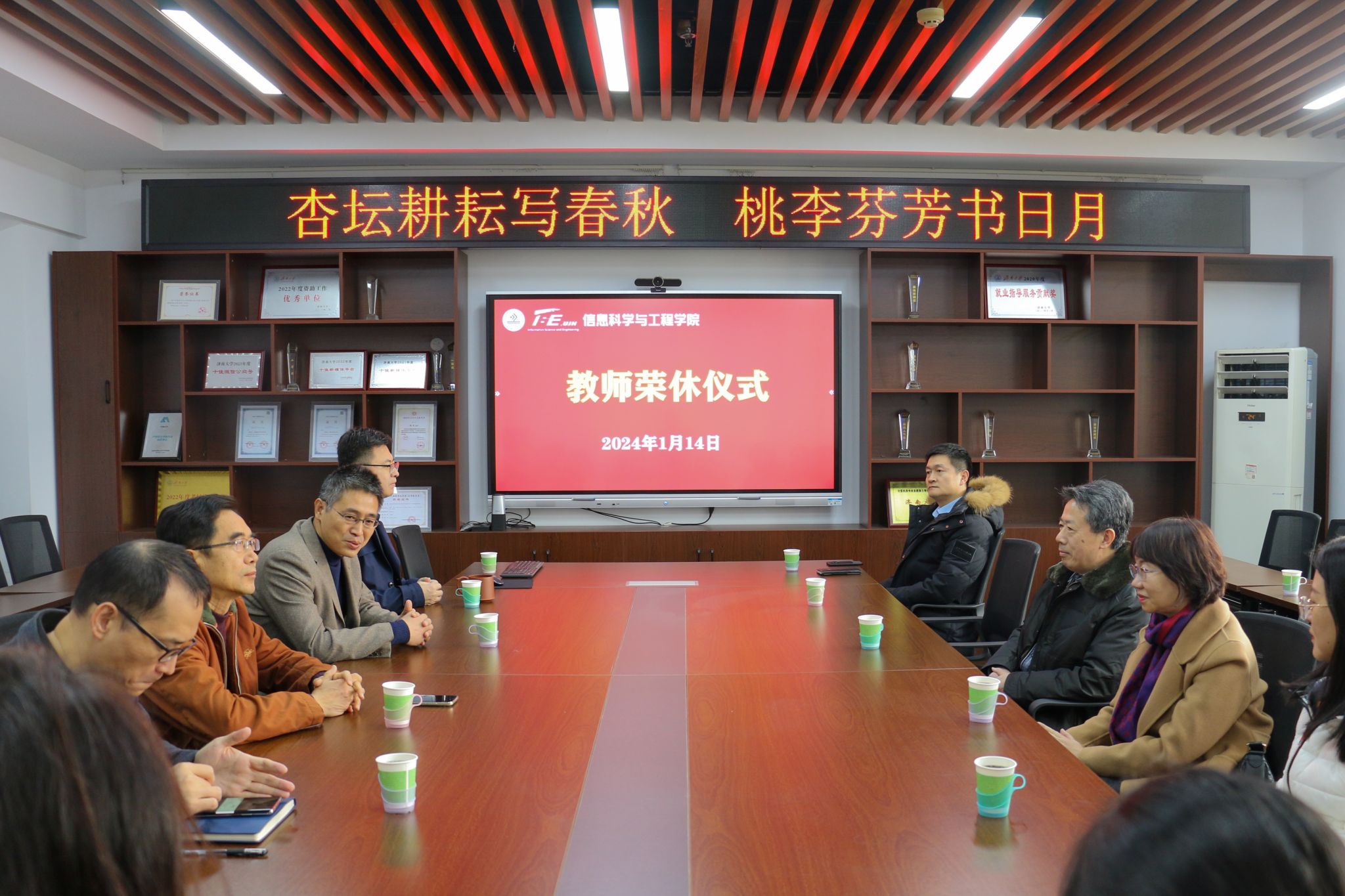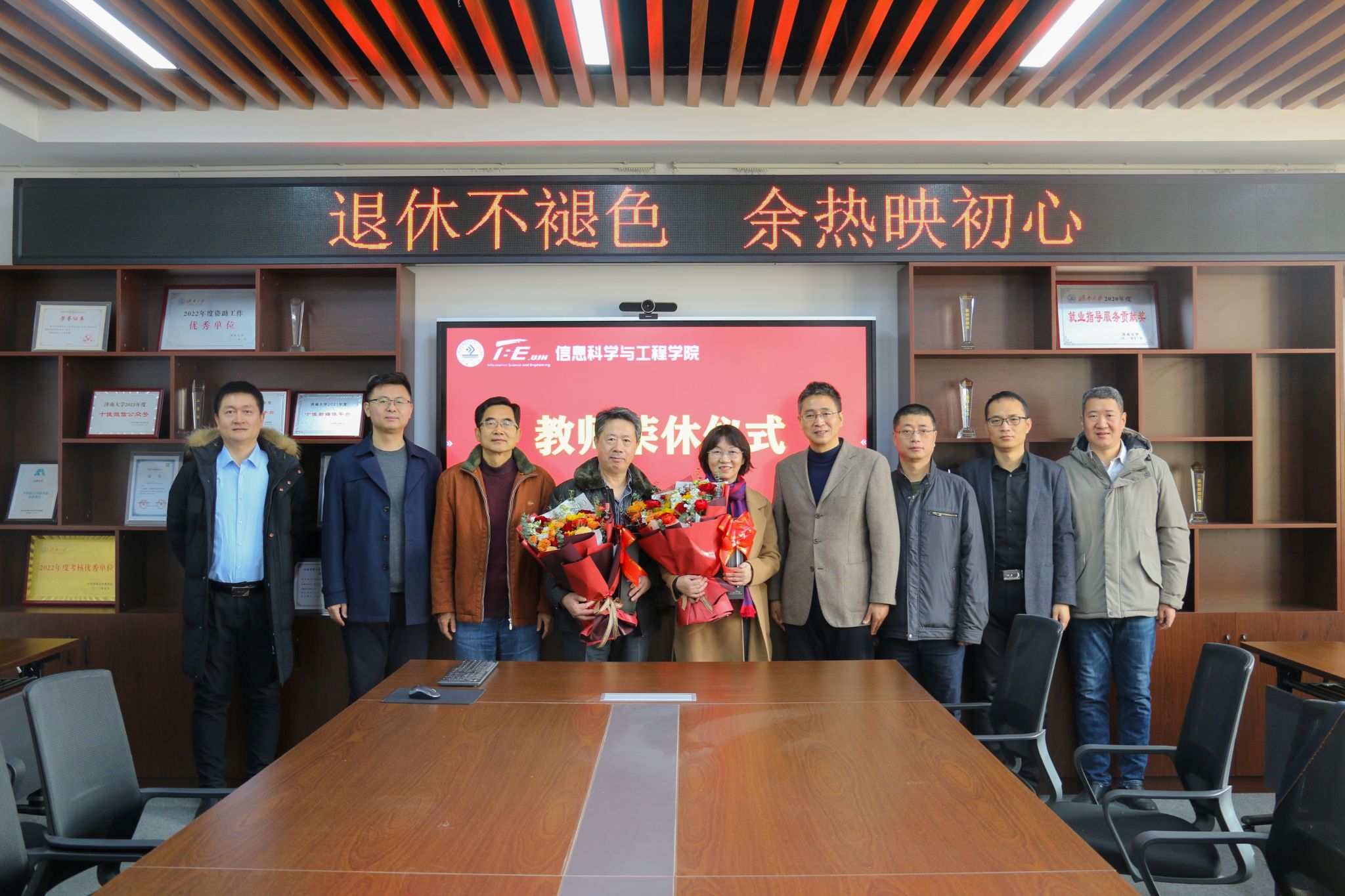 在12教704会议室为董吉文、杨雪梅两位教师举办荣休仪式,学院班子成员、相关系部负责人、退休教师以及教师代表参加仪式,仪式由学院党委书记夏卫东主持。