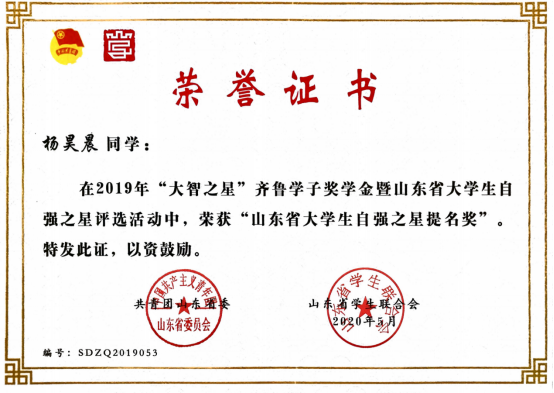 学生杨昊晨荣获“山东省大学生自强之星提名奖”,并拟推荐为山东省2019年度“中国大学生自强之星”人选。